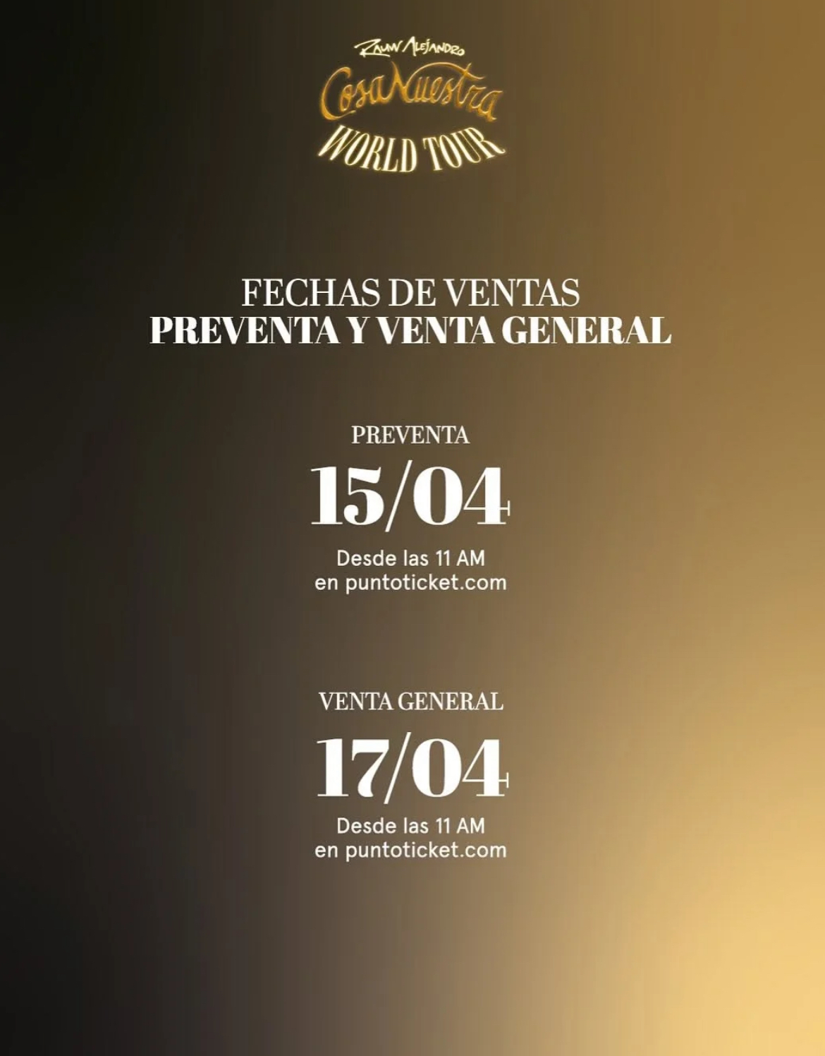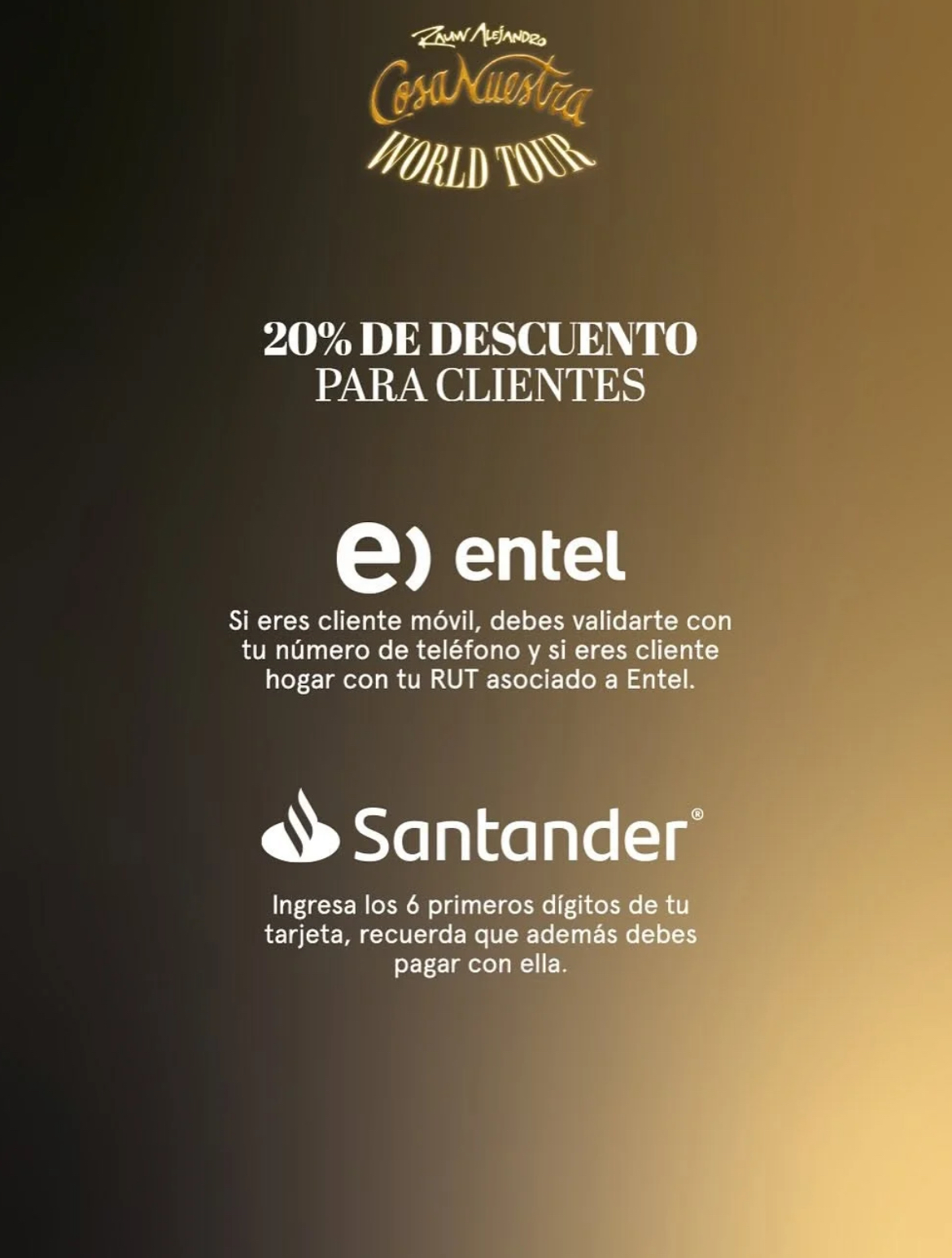 La preventa exclusiva para clientes Banco Santander comenzará el 15 de abril a las 11:00 horas y se extenderá por 48 horas o hasta agotar el stock de entradas con descuento (3.104 tickets disponibles, con un máximo de 4 por persona).