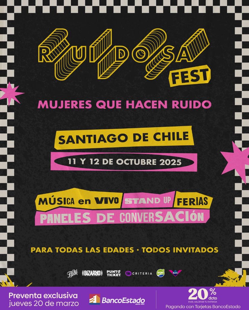 Ruidosa Fest Santiago 2025 contará con dos díasde celebración de la fuerza femenina con conciertos de artistas chilenas e internacionales, stand up comedy, inspiradores paneles de conversación, exhibiciones y una vibrante feria de organizaciones y emprendedoras, esta vez de la mano de la productora Bizarro. Es un evento para todas las edades, donde todos están invitados.